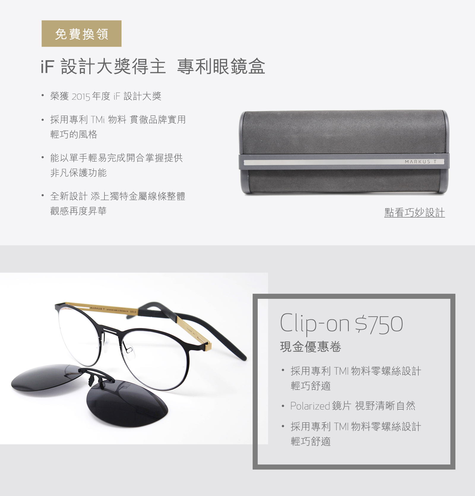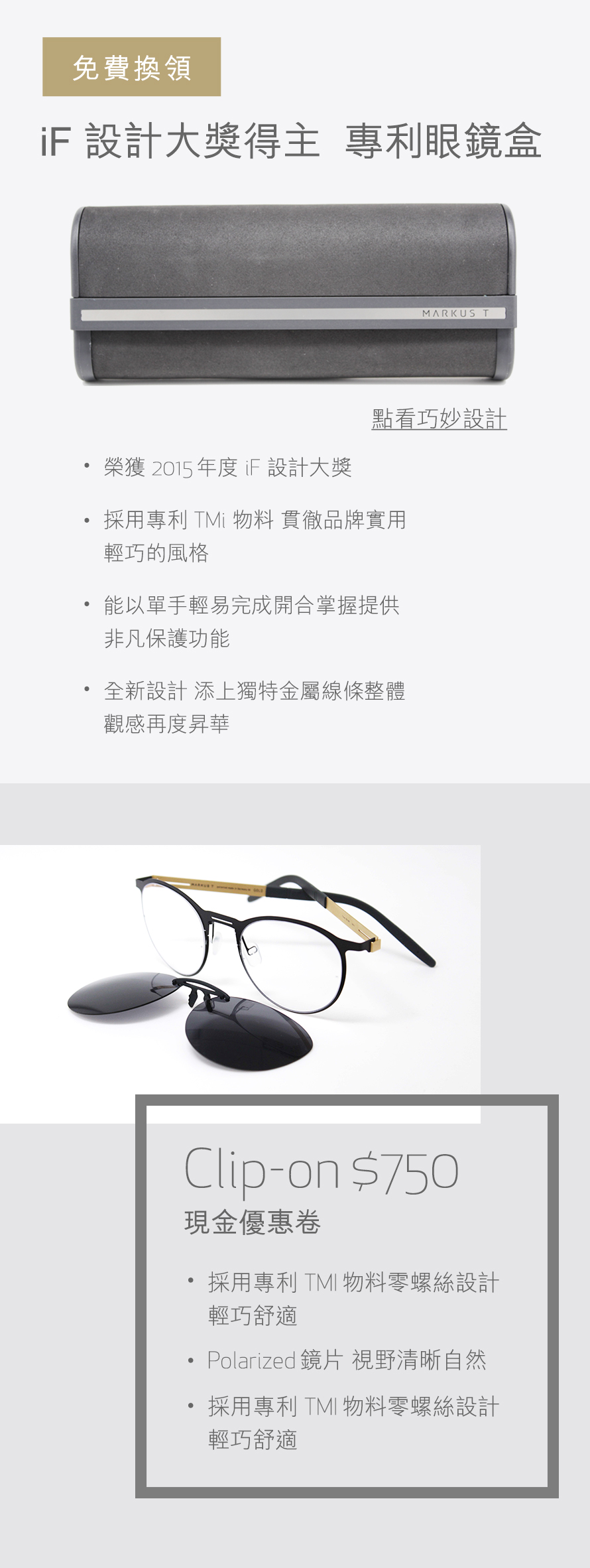 為回饋廣大用家,現凡成功登記成為「Markus T&Fans」,即可享受雙重禮遇: 1. 免費換領新款獲獎眼鏡盒 品味德國環保時尚概念 2. 專利Clip-On優惠券 盡情享受陽光夏日